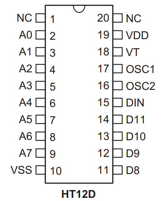 The HT12D is a 212 series CMOS decoder IC designed to work in pair with the HT12E encoder. Its main function is to receive the coded serial data transmitted by the encoder, check the address bits for a match, and then decode the 4-bit data, making it available as parallel outputs. It is widely used in wireless remote control applications such as garage doors, lighting systems, alarms, and remote switches.