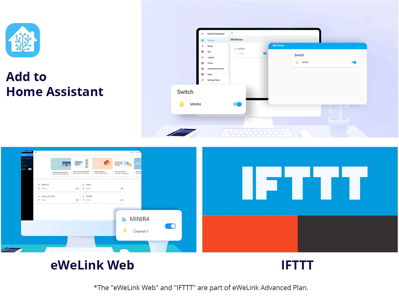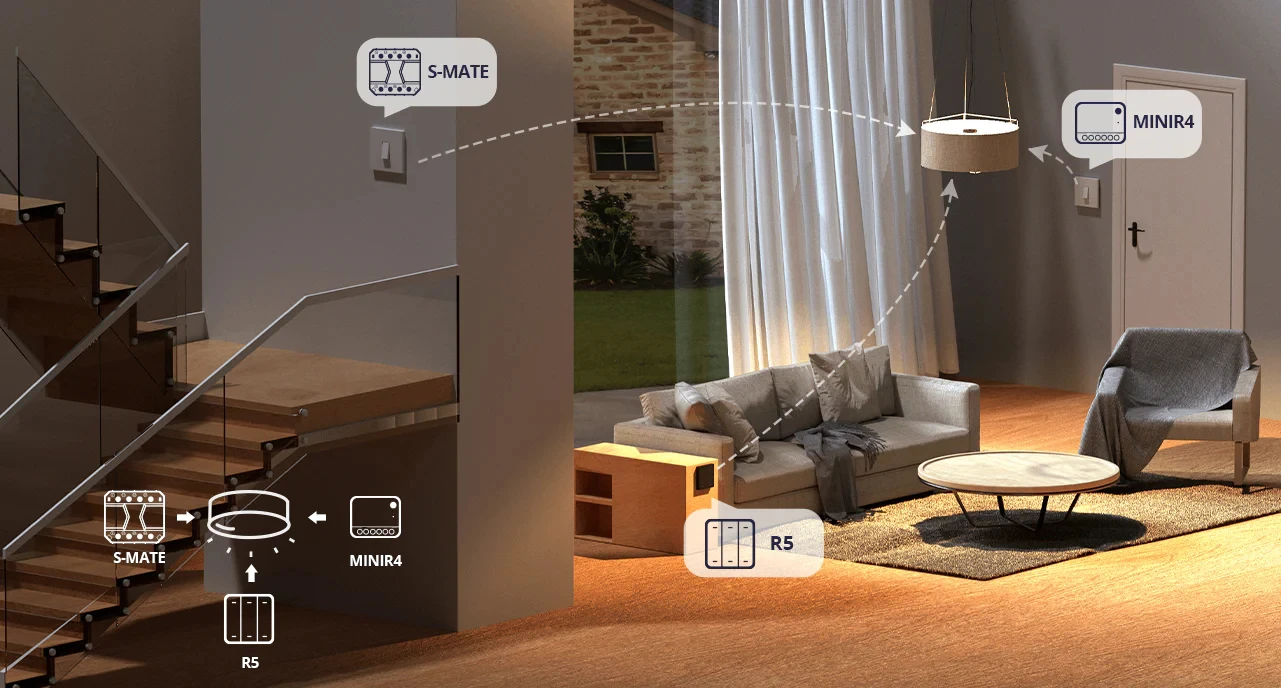 | Multiple Control Method After pairing with MlNlR4, both R5 and S-MATE can act as remote controllers to control MlNlR4 locally through the eWeLink-Remote signal. |